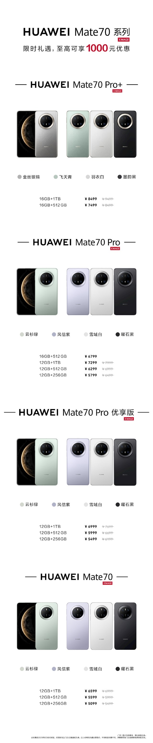 根据官方公布的海报显示,Mate 70标准版优惠400元,Mate 70 Pro优享版优惠700元,Mate 70 Pro优惠700元(除16+512GB外),Mate 70 Pro+版优惠1000元。