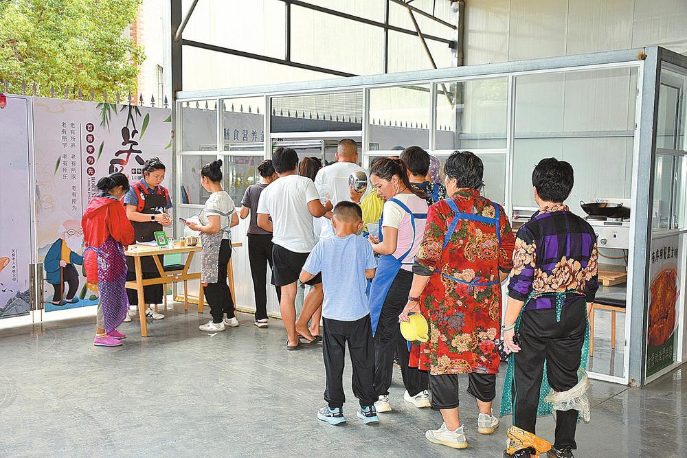 午饭时间临近,“一元食堂”开始热闹起来,社区志愿者们开始有序盛饭、打菜,居民们排队就餐。