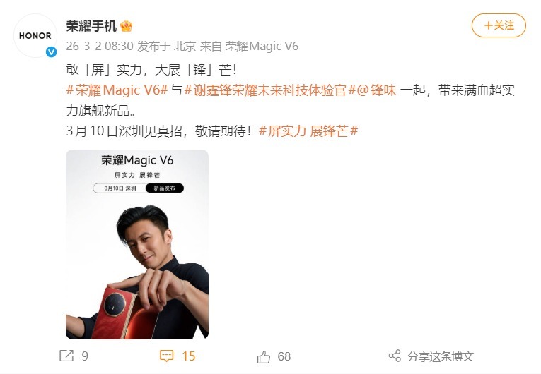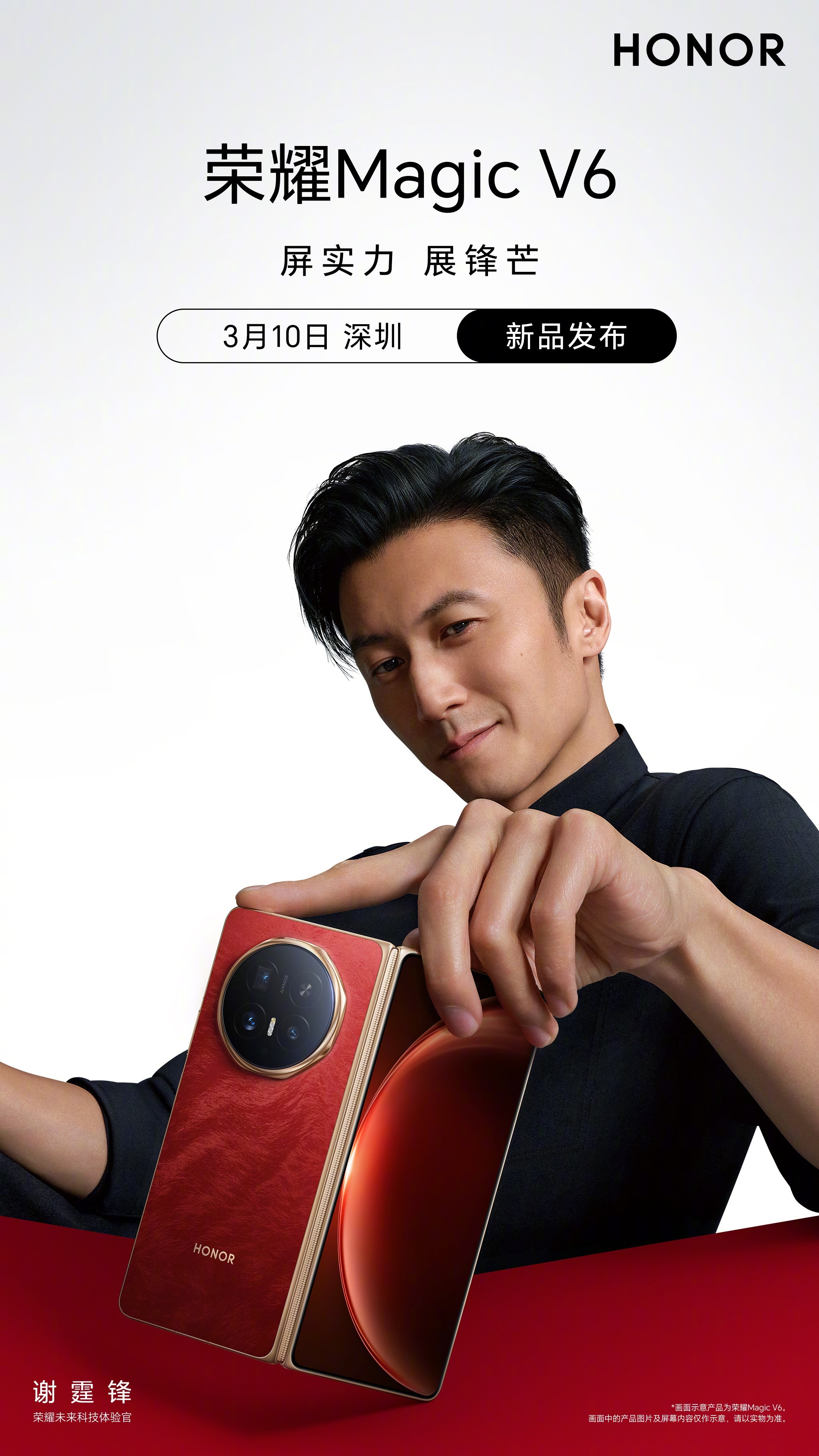 3月2日消息,荣耀官方正式官宣,全新折叠屏旗舰荣耀Magic V6将于3月10日在深圳举办国内新品发布会。此次发布会邀谢霆锋出任荣耀未来科技体验官,携手解锁折叠屏全维度新体验。而这款旗舰此前已在3月1日MWC 2026上完成全球首发,凭借跨代技术突破成为行业焦点,此次国内发布将揭晓更多产品细节与市场信息。
